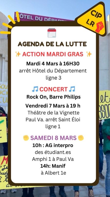 - samedi 8 mars : – 10h AG interpro à l’université P.Valéry – 14h Manif place Albert 1er